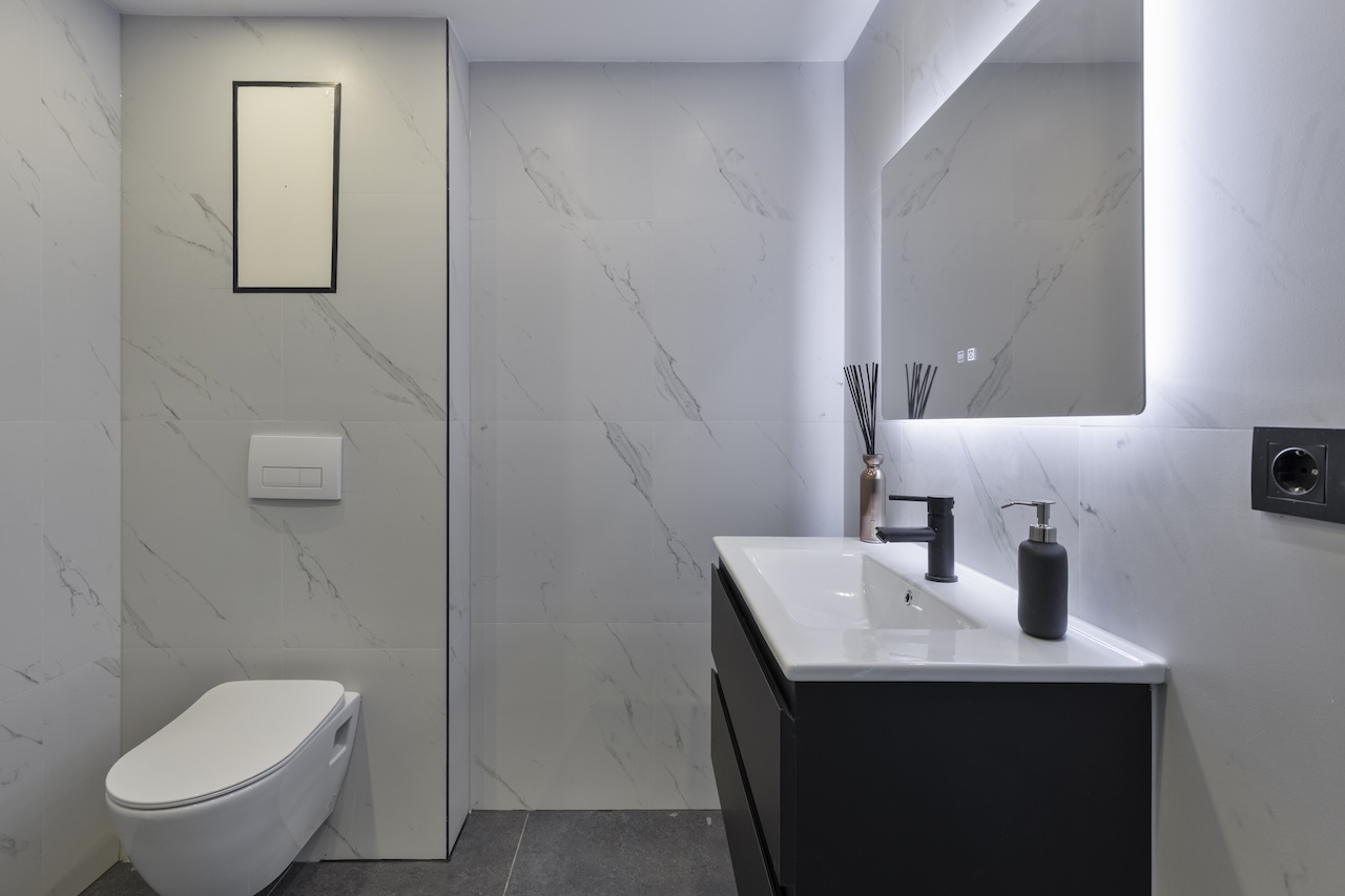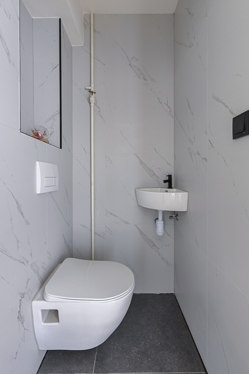 – Keurig wit/zwart betegelde badkamer (ca. 2,60 x 2,00m) met douche, toilet en badkamermeubel.