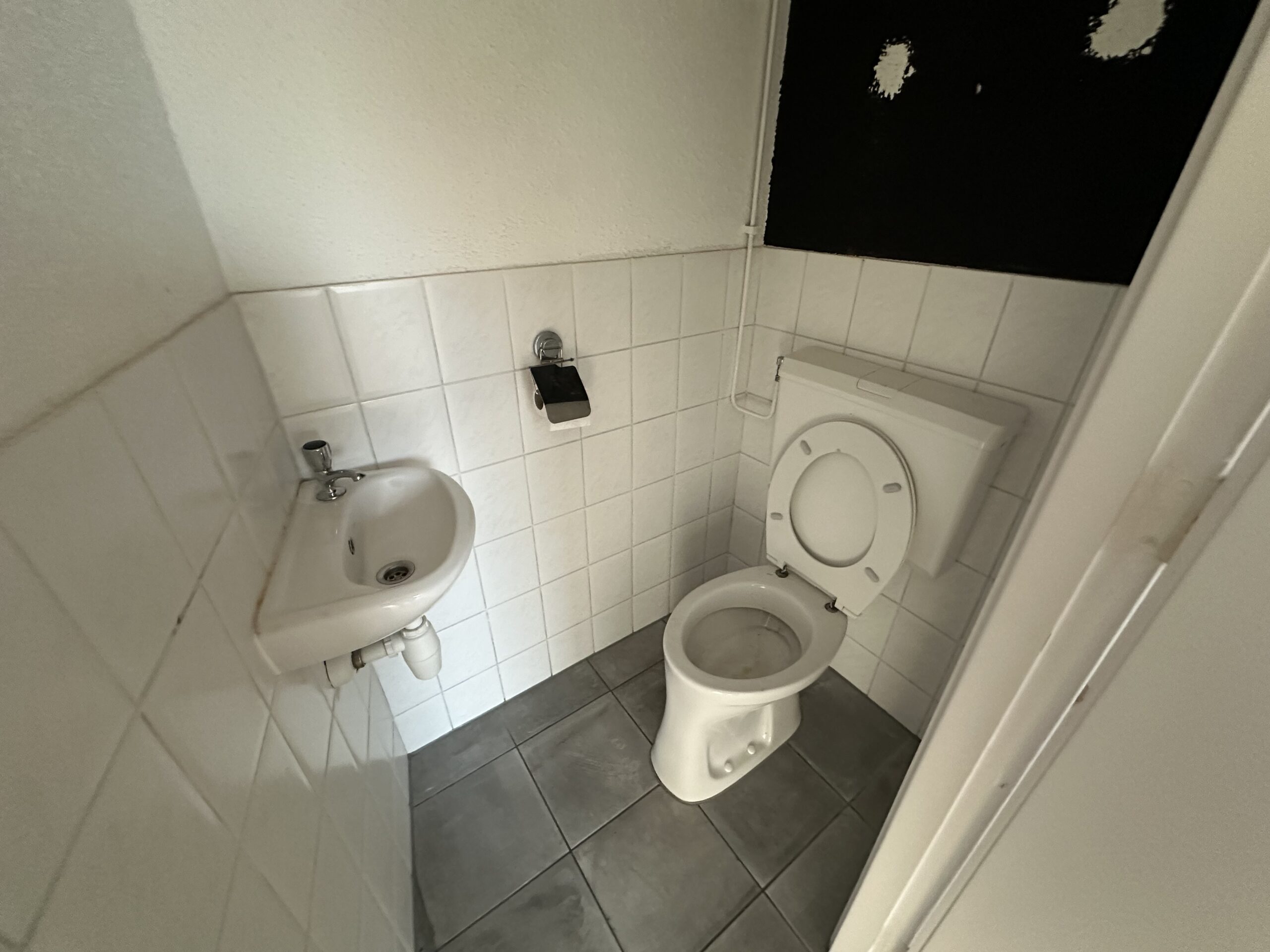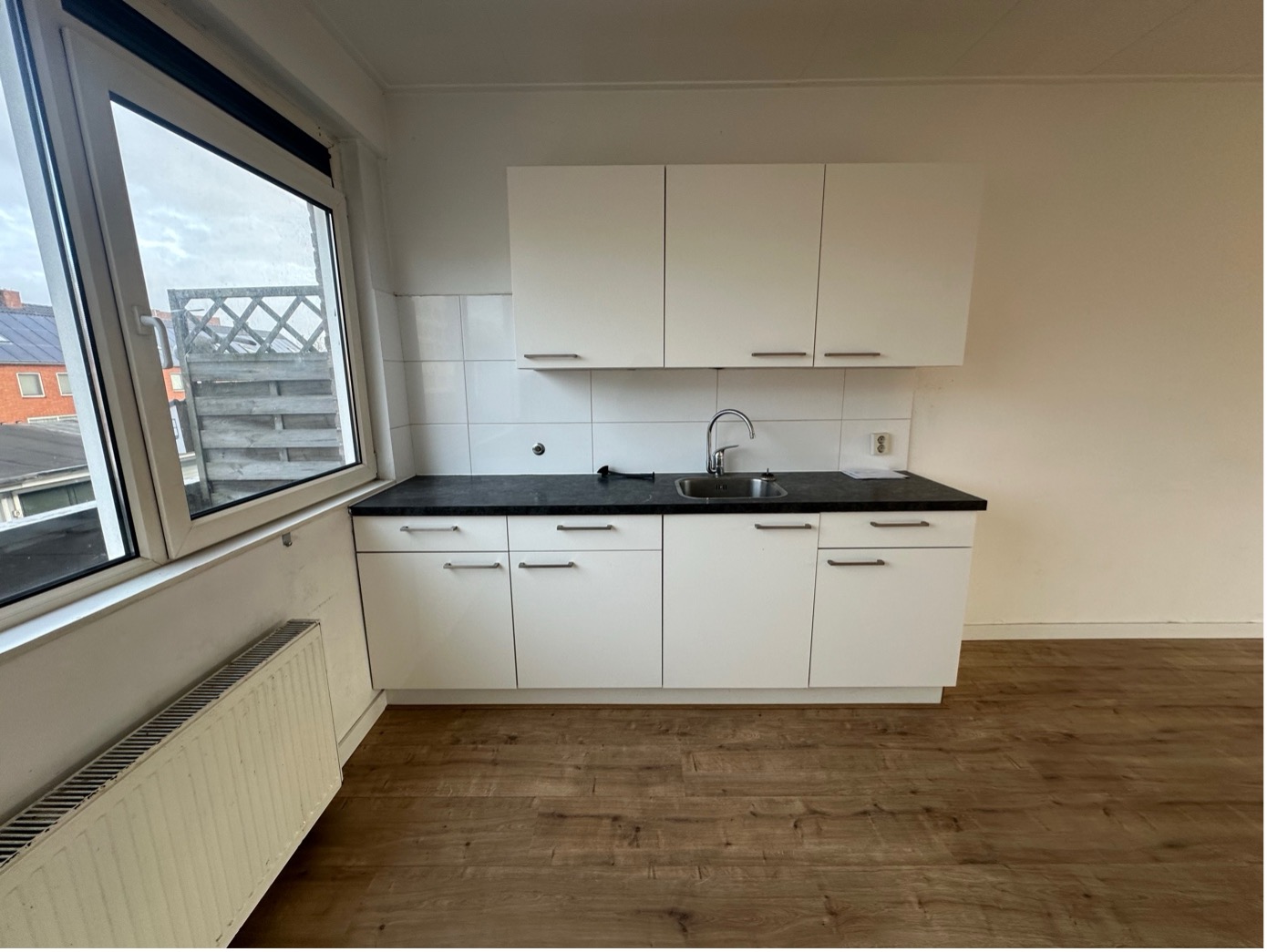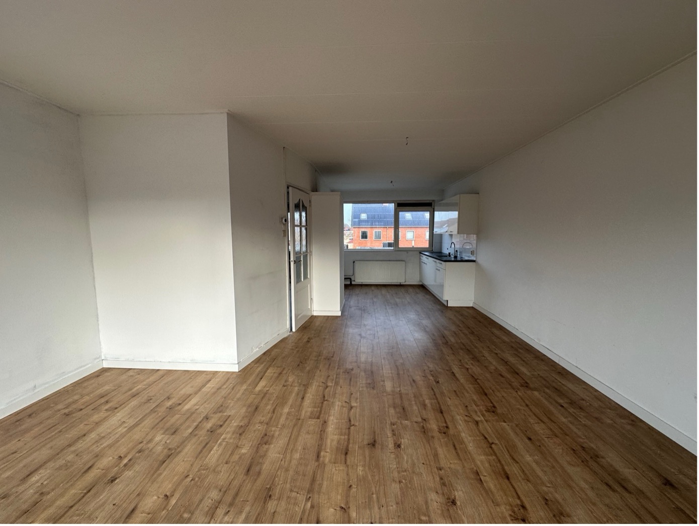 Overloop met toegang tot het balkon, trap naar de tweede verdieping, wit betegelde toilet met vaste wastafel, ruime woonkamer (ca. 8,40 x 3,40m + 3,30 x 1,50m) met open keuken. De wit betegelde keuken beschikt over een wit keukenblok, wit aanrechtblad, afzuigkap, drie bovenkasten, vaatwasmachineaansluiting en wasmachineaansluiting.