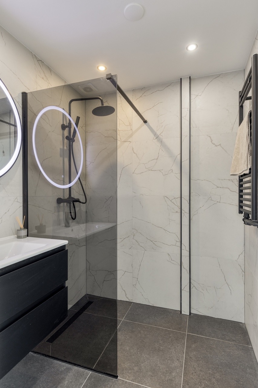 – Keurig wit betegelde badkamer (ca. 1,80 x 1,70m) met (inloop)douche, wastafel en radiator.