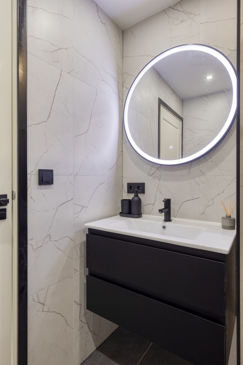 – De keuken (ca. 4,80 x 3,00 m) beschikt over een witmarmeren aanrechtblad, zwart keukenblok met apparatuur als een koelkast, vriezer, 4-pits inductiekookplaat, afzuigkap, vaatwasser, combimagnetron en heeft toegang tot het balkon.