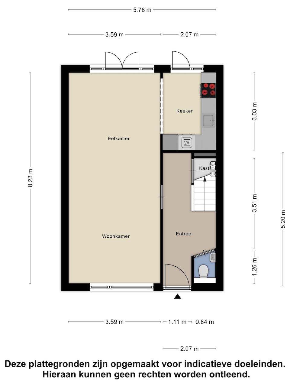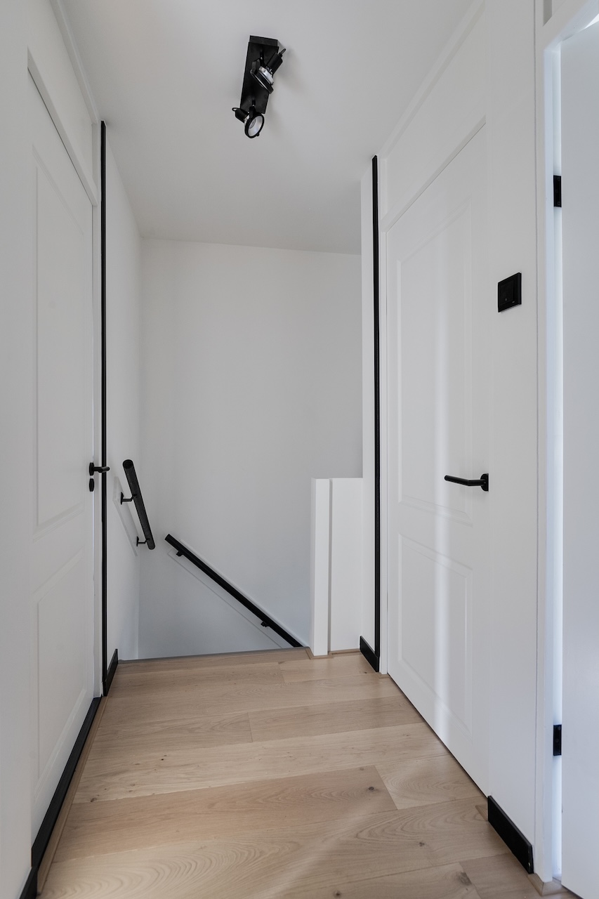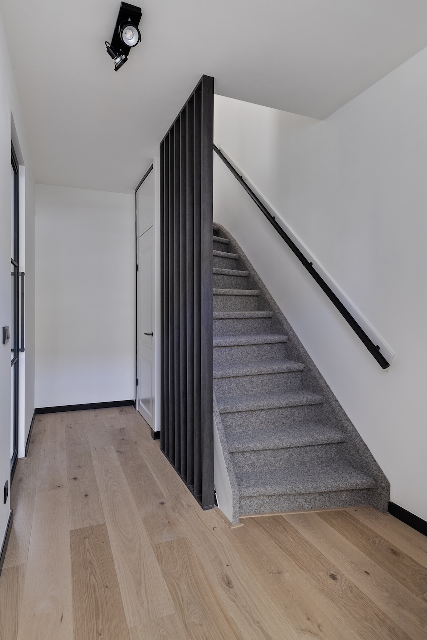 – Gang met toegang tot de trap, toilet met wastafel en woonkamer.