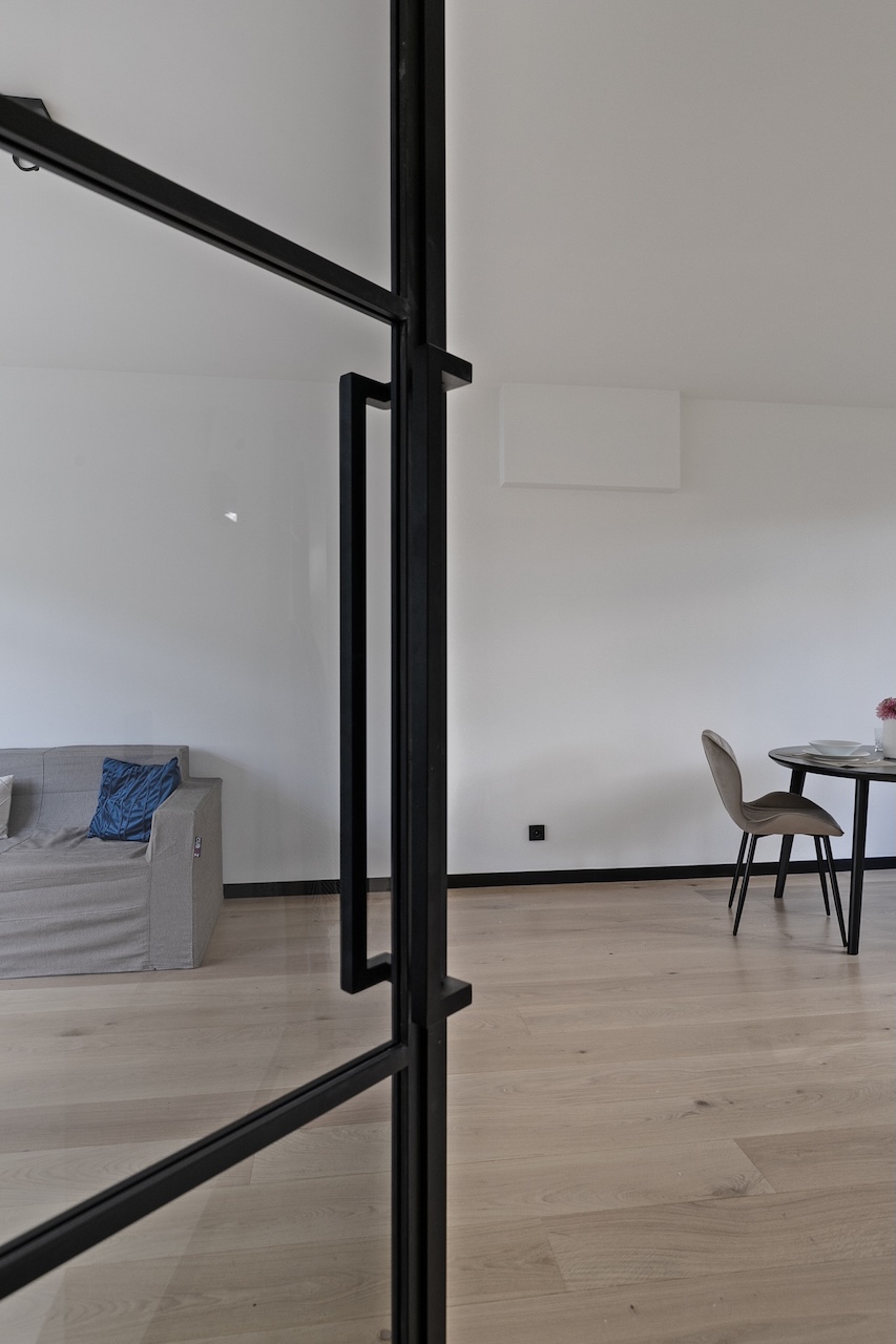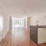 – Woonkamer (ca. 3,60 x 8,20m) met open keuken en toegang tot de tuin.