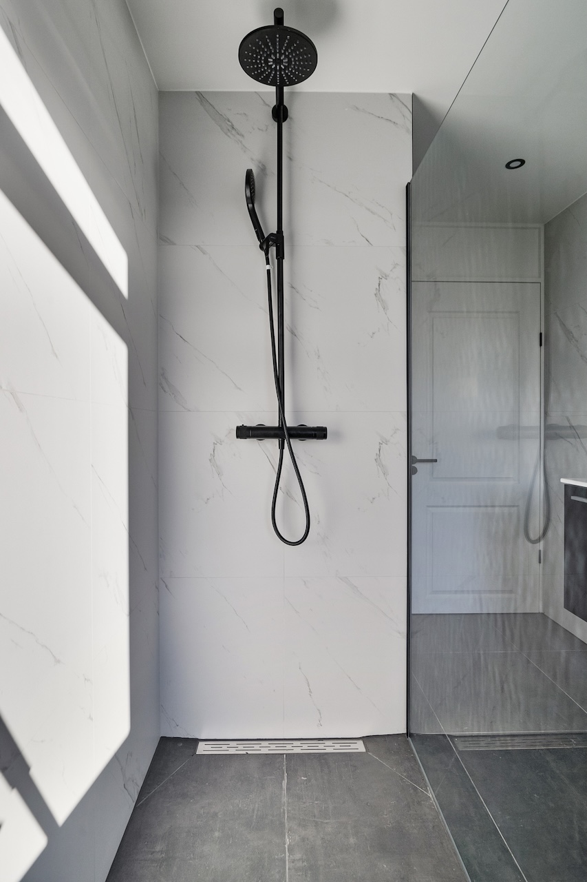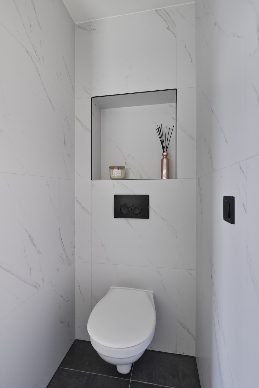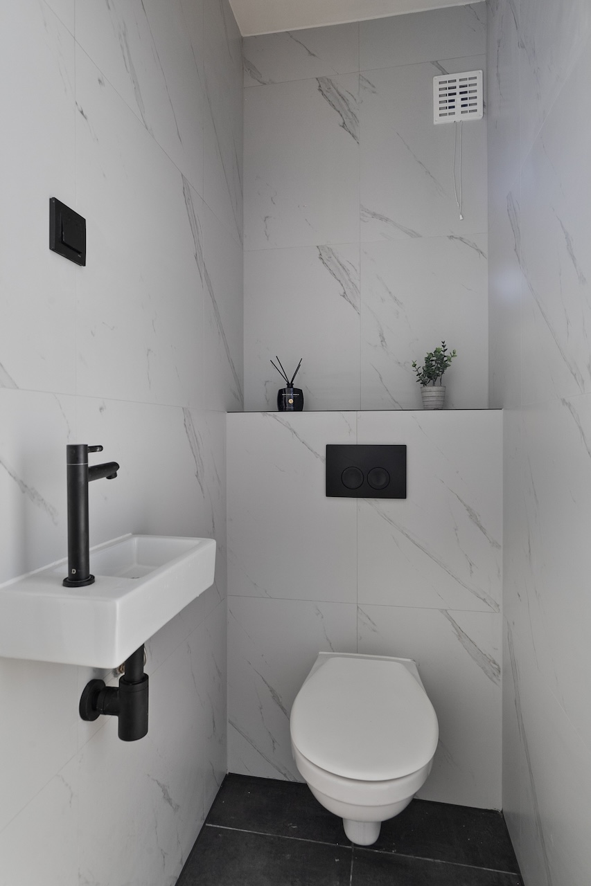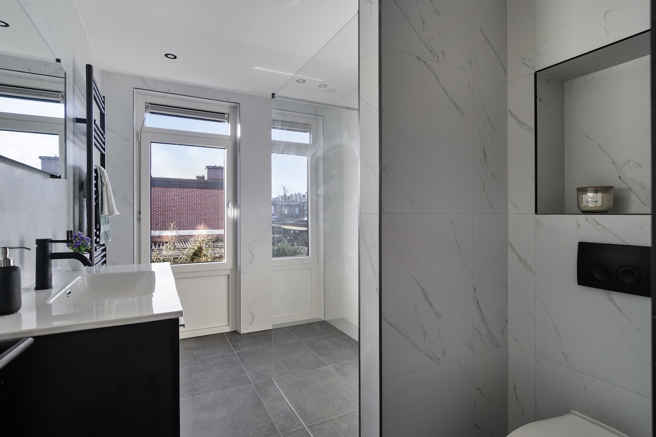 – Keurig wit marmer betegelde badkamer (ca. 2,00 x 3,30m) met (inloop)douche, toilet, wastafel en radiator.
