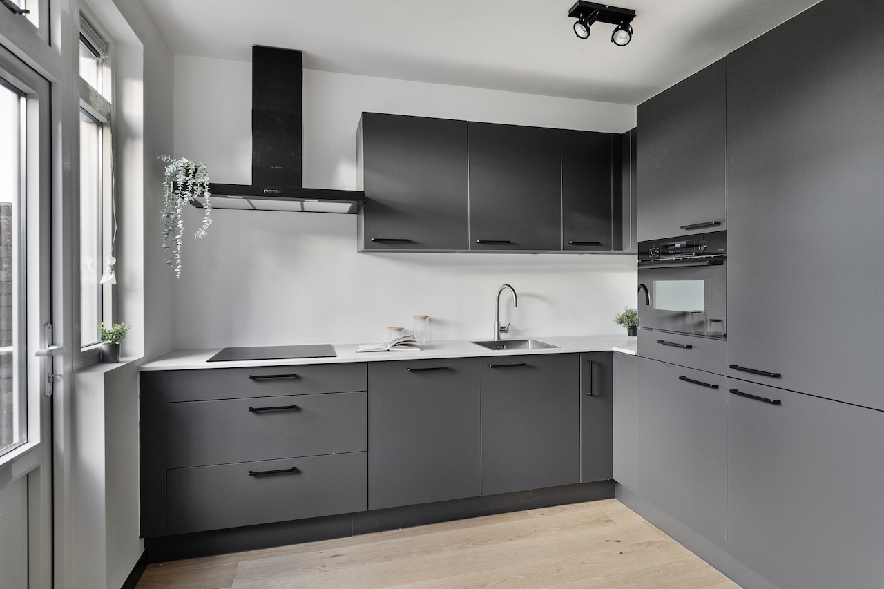 – De keuken (ca. 2,10 x 3,00m) beschikt over een witmarmeren aanrechtblad, zwart keukenblok met apparatuur als een koelkast, vriezer, 4-pits inductiekookplaat, afzuigkap, vaatwasser, combimagnetron en heeft toegang tot de tuin.