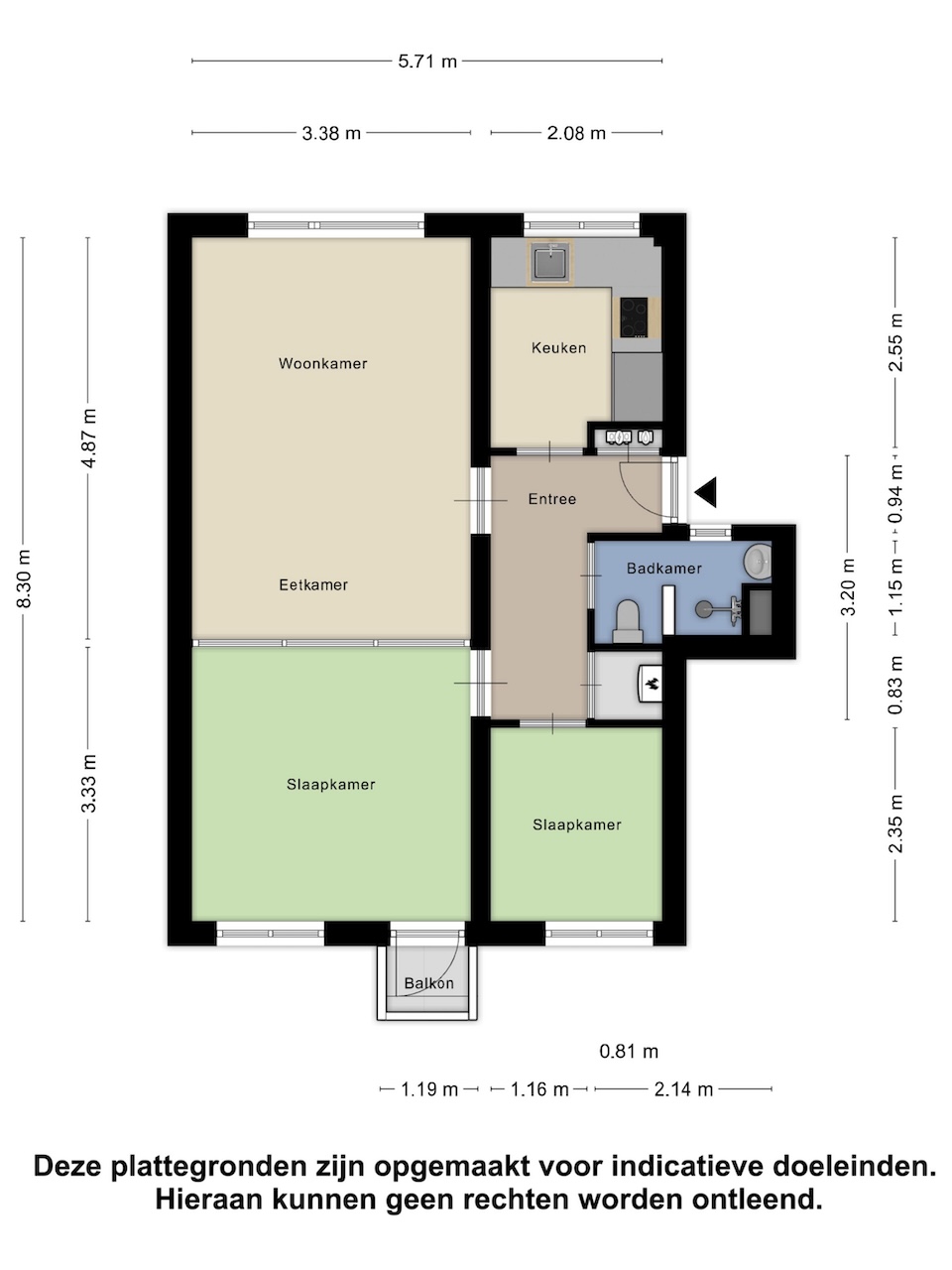 – Slaapkamers (respectievelijk ca. 3,40 x 3,30m en 2,40 x 2,10m);