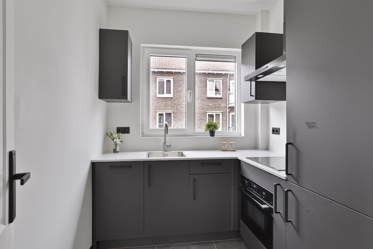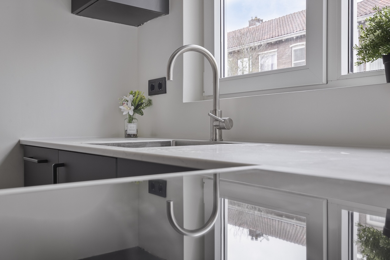 De keuken (ca. 2,60 x 2,10m) beschikt over een witmarmeren aanrechtblad, zwart keukenblok met apparatuur als een koelkast met vriesvak, vaatwasser, 4-pits inductiekookplaat en afzuigkap;