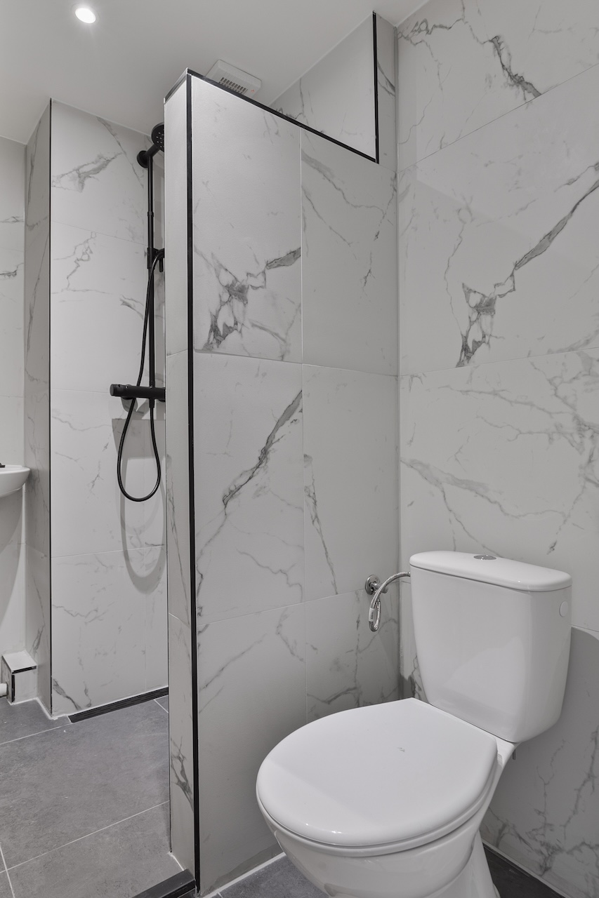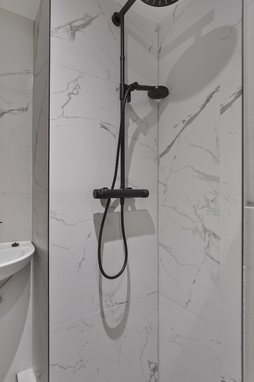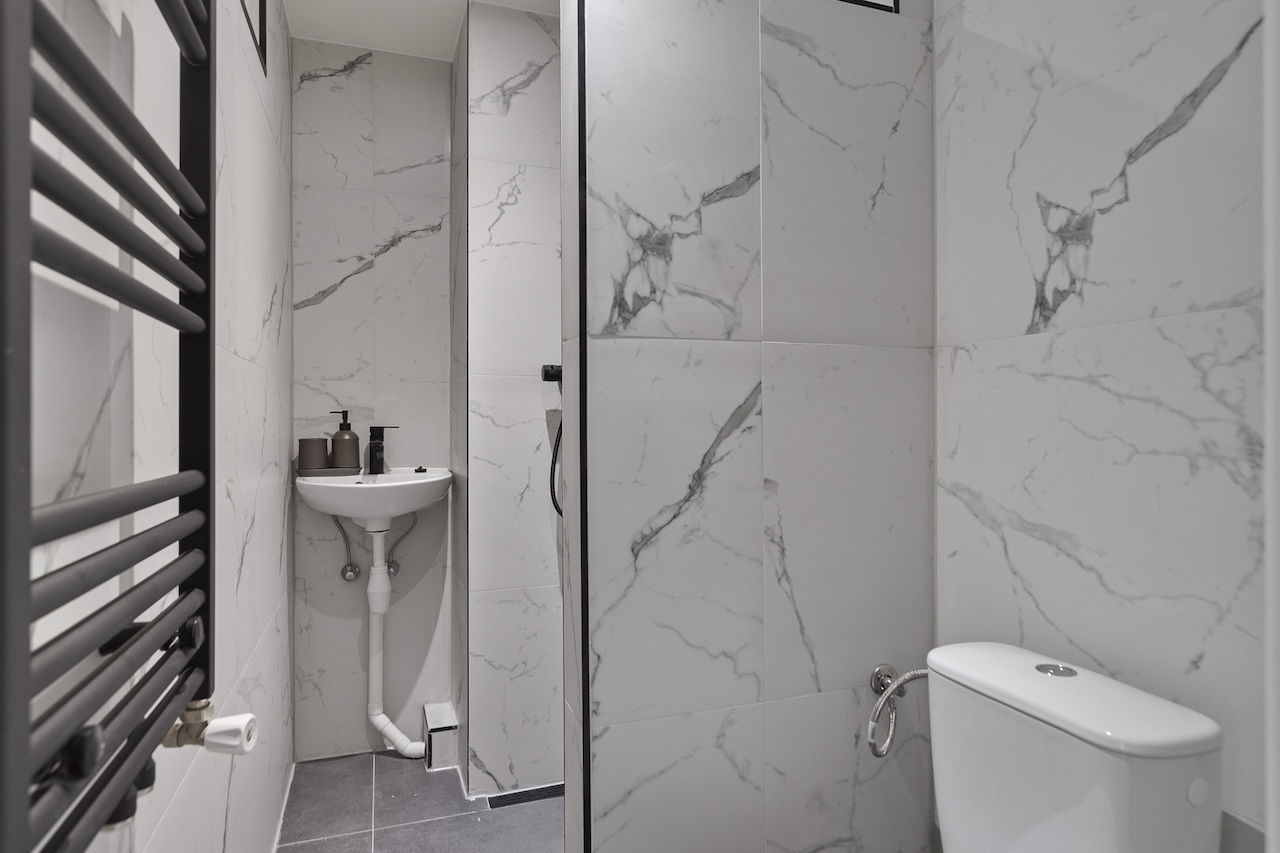– Keurig wit/zwart betegelde badkamer (ca. 2,10 x 1,20m) met douche, toilet, badkamermeubel en radiator.